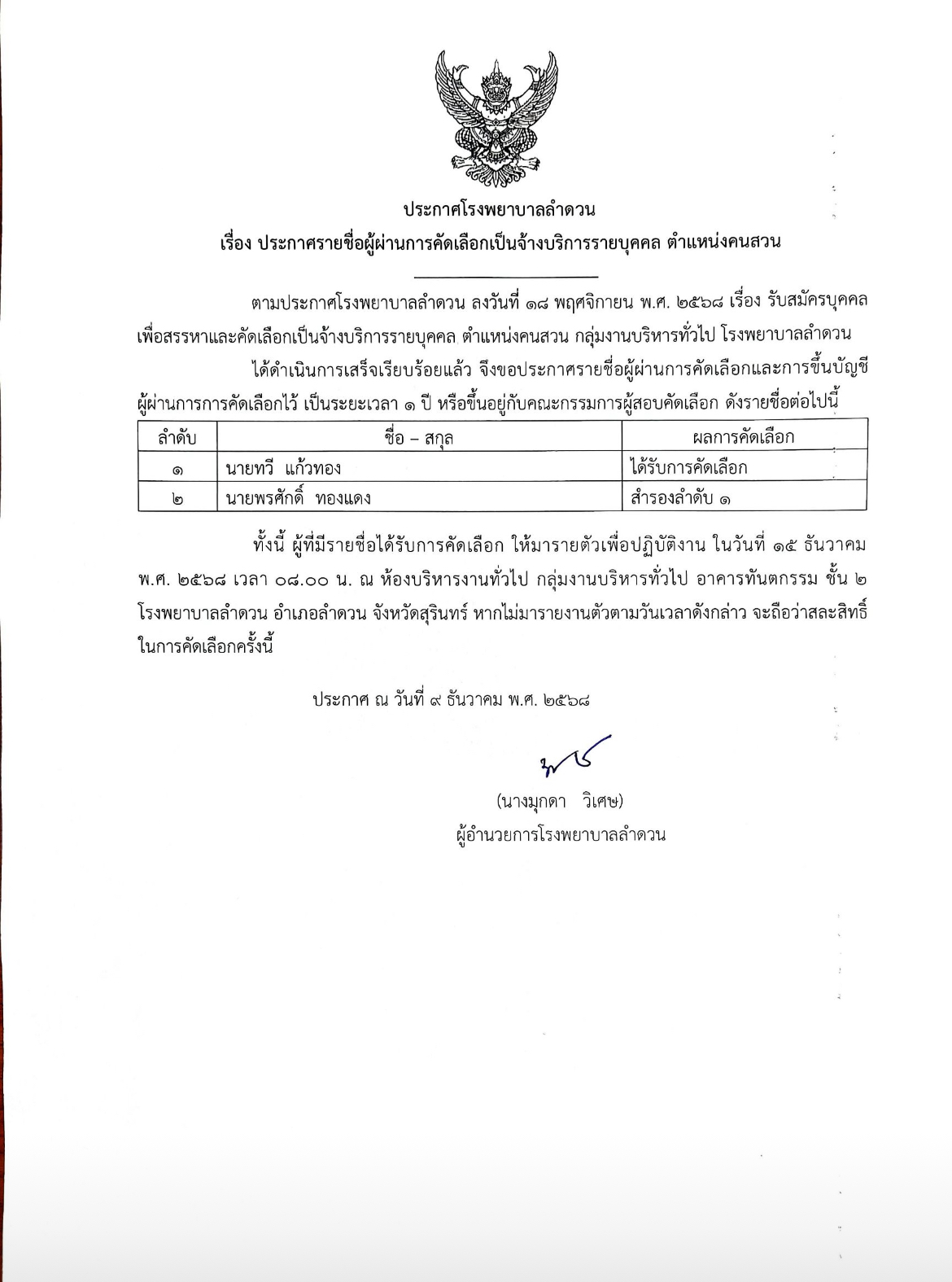รายชื่อผู้ผ่านการคัดเลือก ตำแหน่ง"คนสวน"