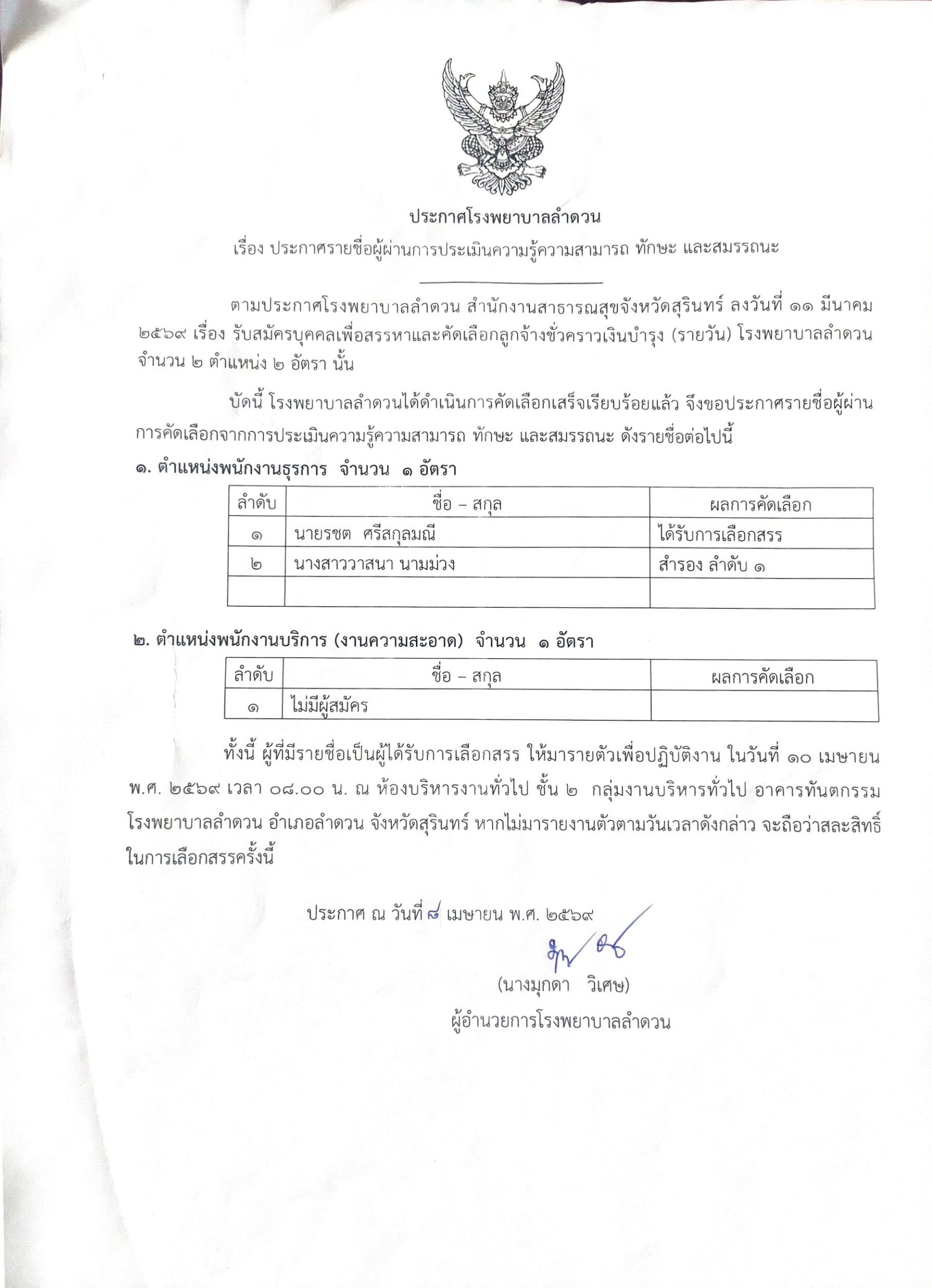 2. ประกาศโรงพยาบาลลำดวน